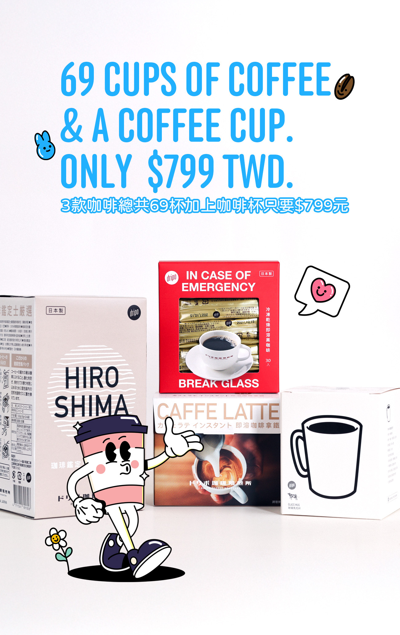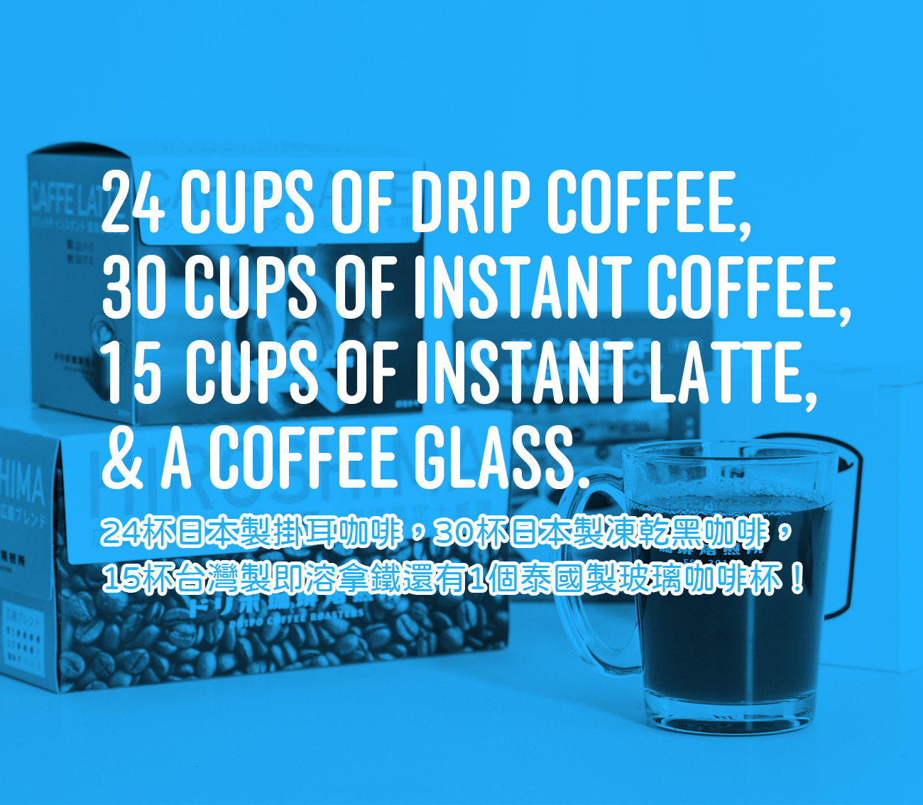 30杯日本製冷凍乾燥黑咖啡+24杯日本製廣島咖啡掛耳包+15杯台製即溶咖啡拿鐵,一共69杯,讓你變化風味喝不膩!再加上1個咖啡杯,搞定2個月的咖啡只要台幣799元,一次購買2組只要1500元。平均一天咖啡只要10元。新加入會員還能再享有50元折價優惠!