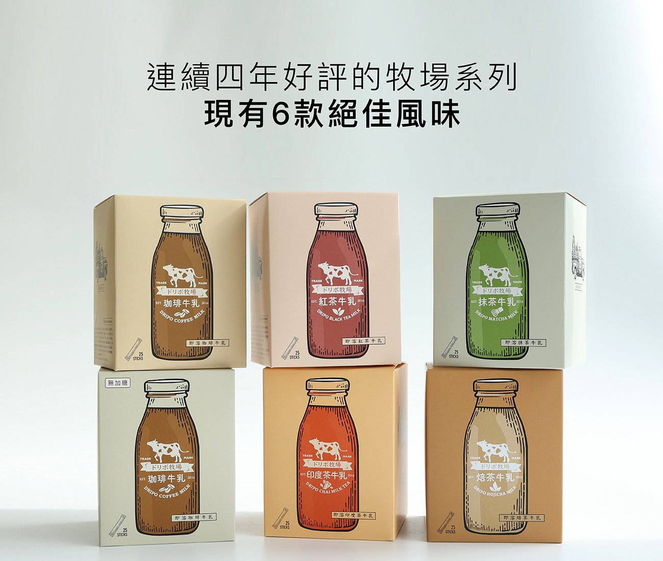 從2018年底推出第一款咖啡牛乳即溶飲品後,ドリポ牧場以獨家的牛乳風味持續受到喜愛,陸續推出紅茶牛乳,印度茶牛乳,抹茶牛乳,焙茶牛乳,風味上一貫的乳香濃郁,而且滋味十足,在購物網站上不時蟬連銷售排行榜第一。