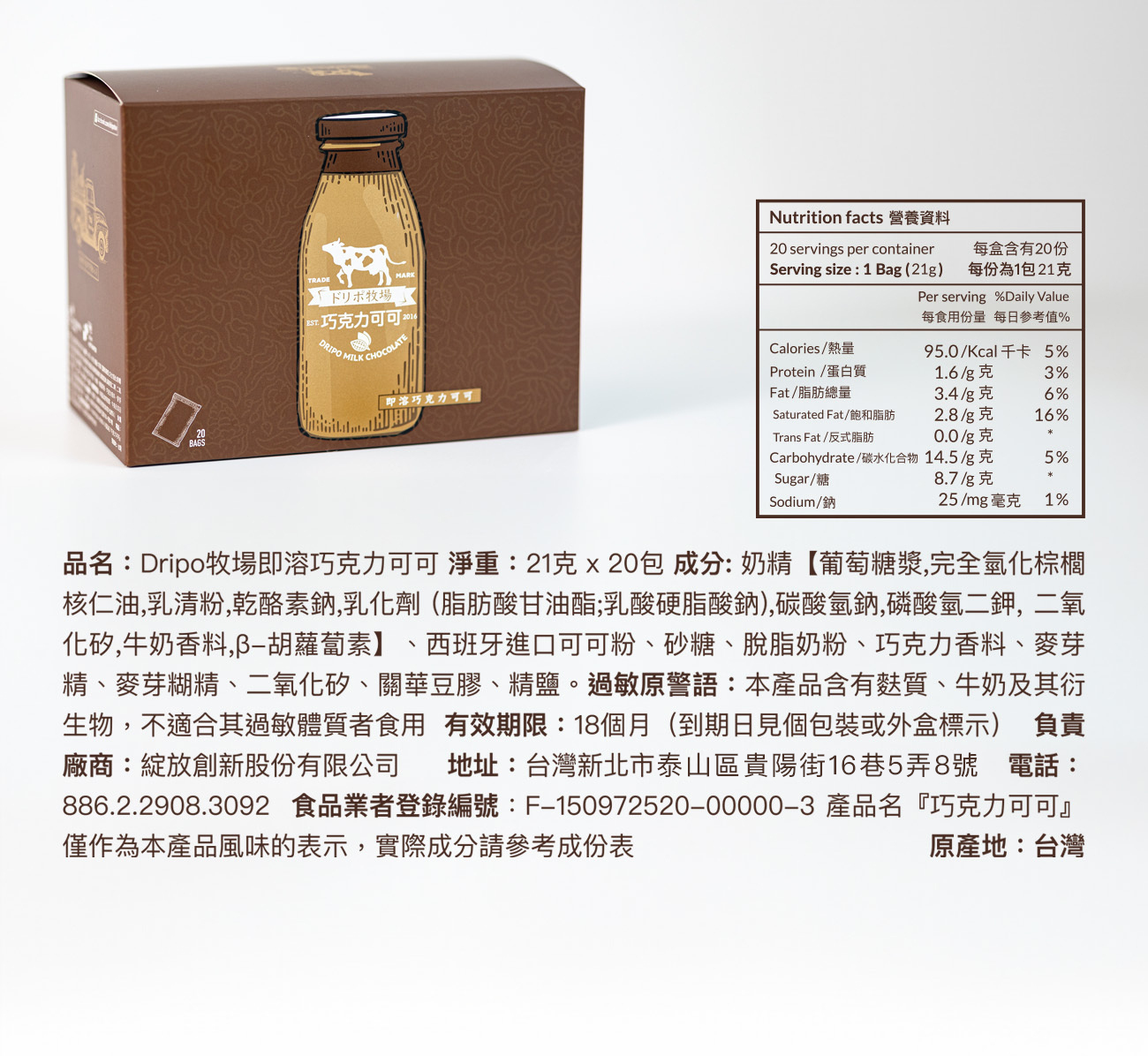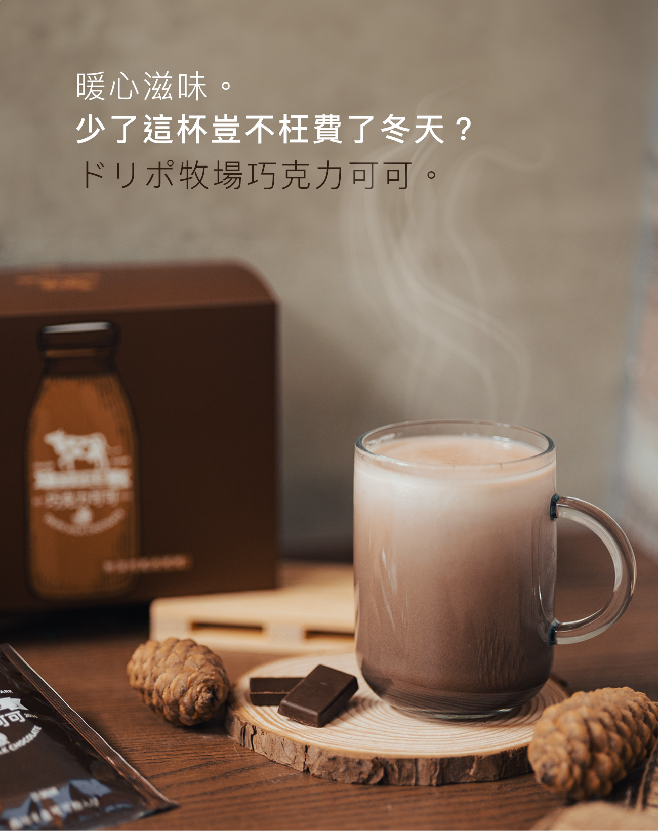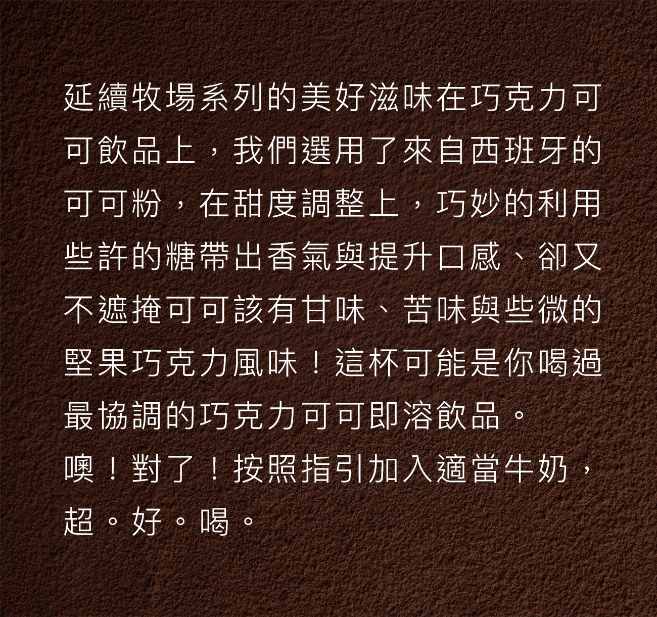 延續牧場系列的美好滋味在巧克力可可飲品,選用了來自西班牙的可可粉,巧妙的利用些許的糖帶出香氣與提升口感、卻又不遮掩可可該有甘味、苦味與堅果巧克力風味!這杯可能是你喝過最協調的巧克力可可即溶飲品。噢!對了!按照指引加入適當牛奶,超。好。喝。