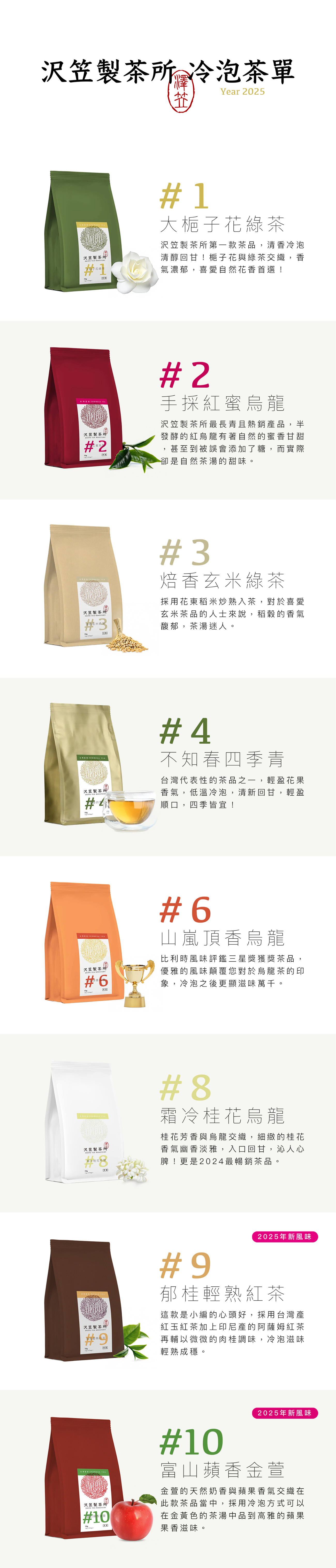 2022年首次推出,DRIPO茶葉副品牌-沢笠製茶所,就大獲台港澳的朋友喜歡。為您帶來台灣的特色茶湯風味。冷泡茶每包大容量6g裝,搭配專屬TRITAN冷泡水壺剛剛好,讓你輕鬆在家製作冷泡茶品。