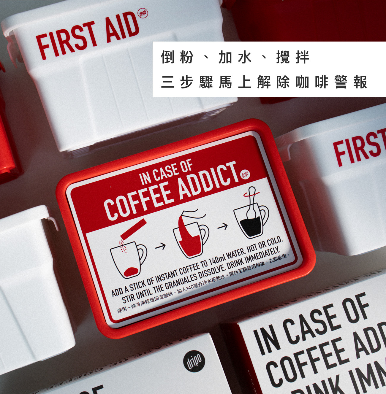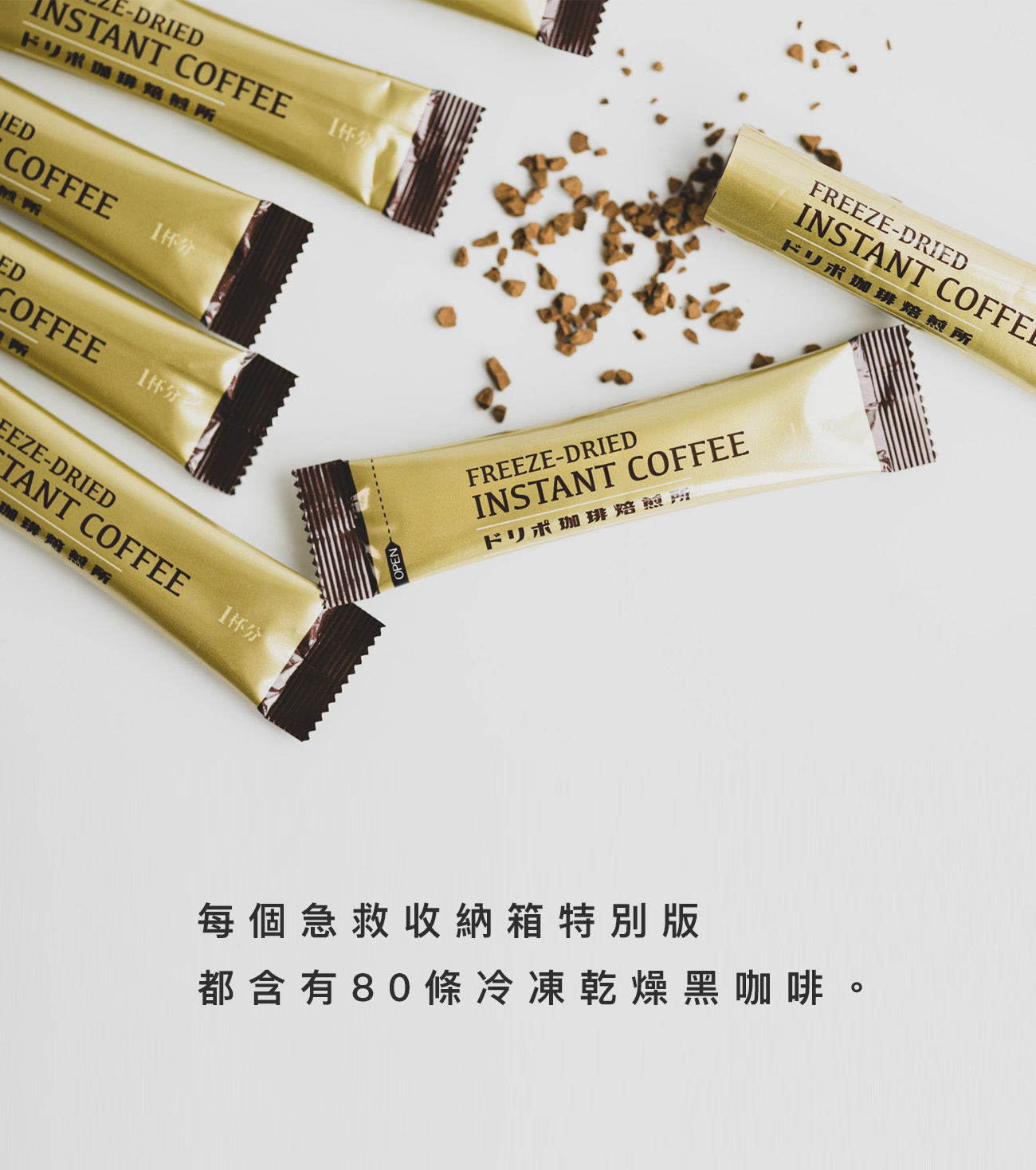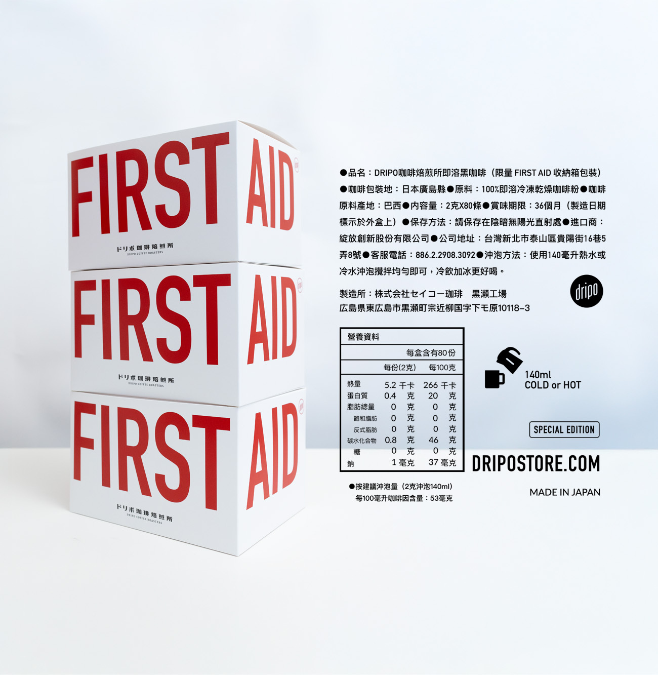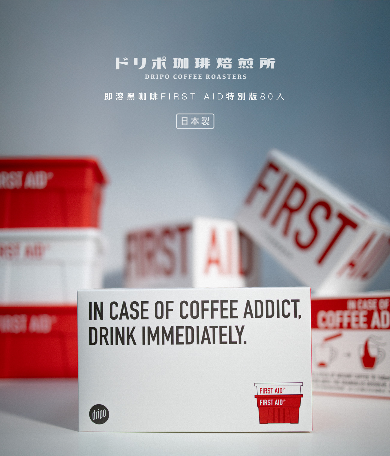 Dripo第一個日本製產品,由50年歷史廣島咖啡公司生產,小包裝即溶黑咖啡解決你隨時隨地來杯咖啡的小問題,FIRST AID收納箱特別版包裝80入780元。除了自用也是分送給朋友的好禮物!